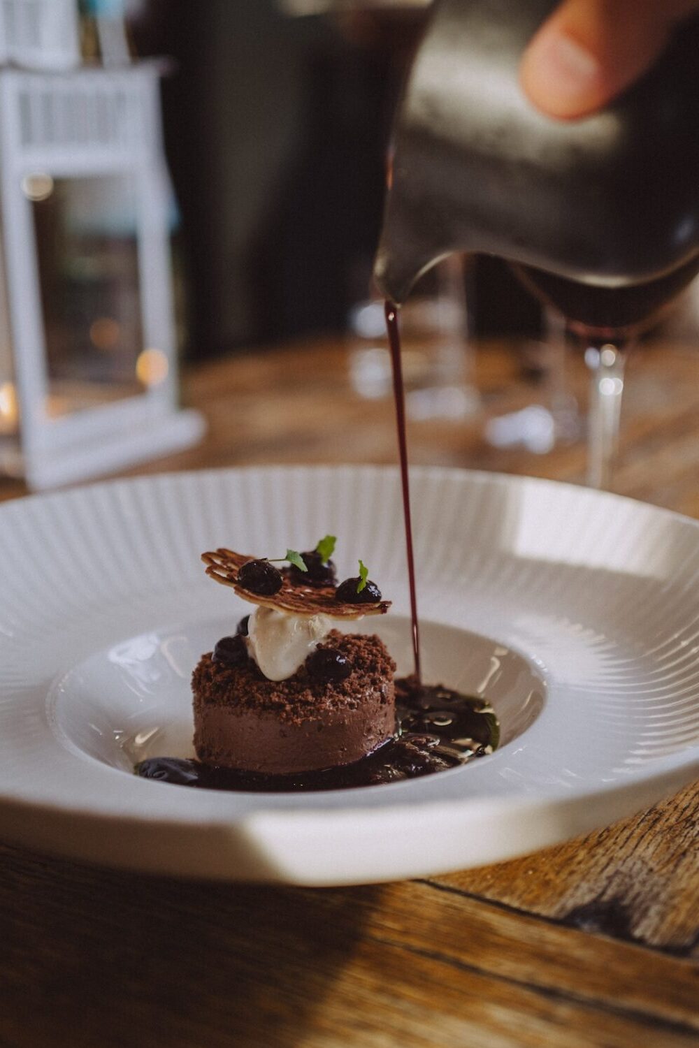 FIRST - Cheesecake von belgischer Callebaut - Schokolade | Blaubeeren - Sorbet | Rooibos - Tee | Fleur de Sel